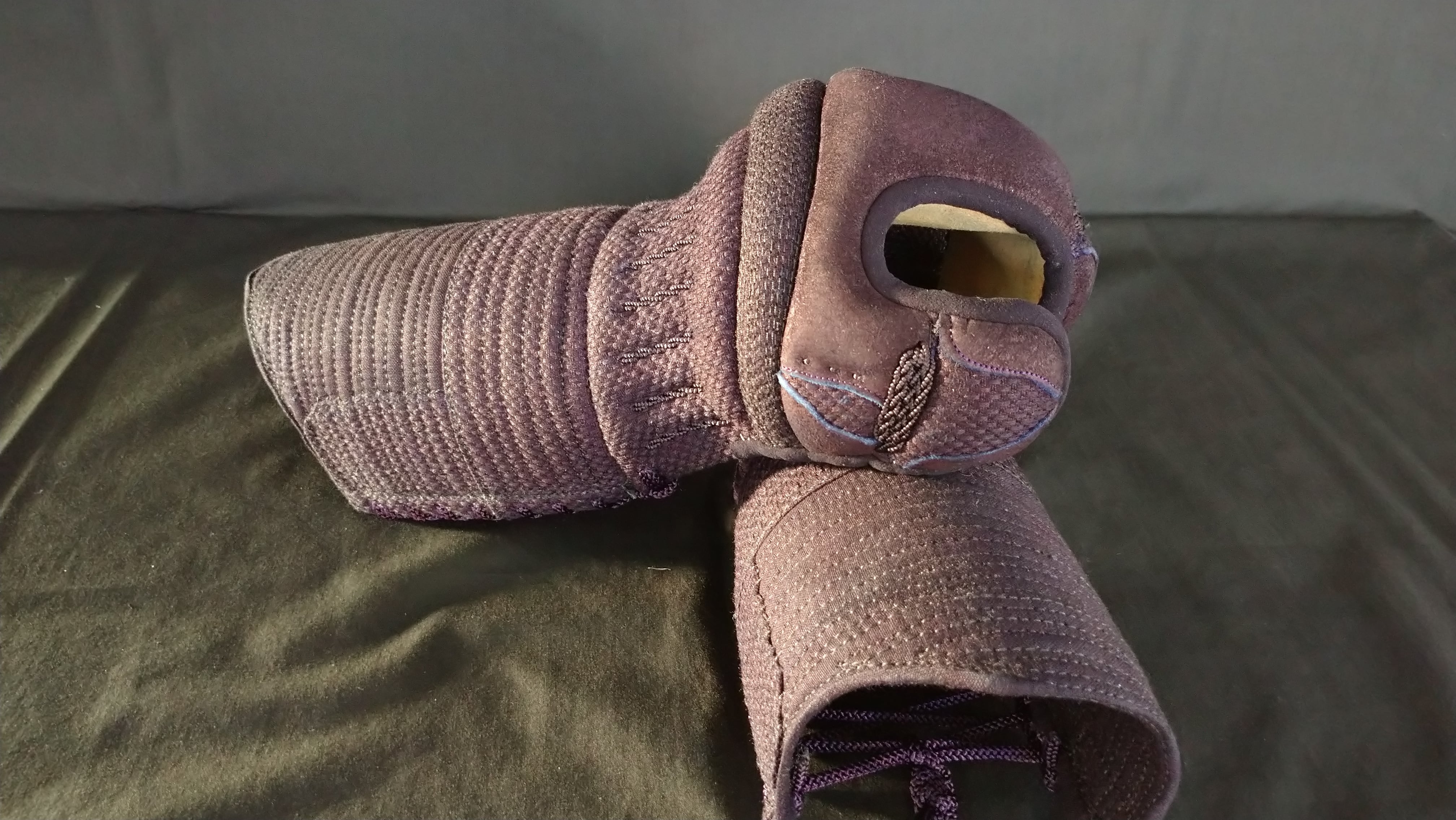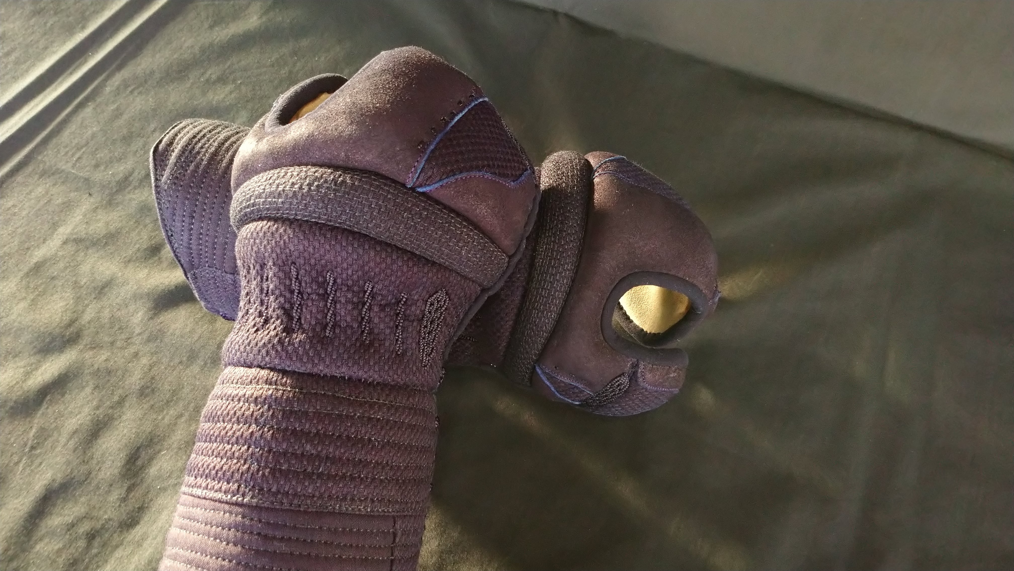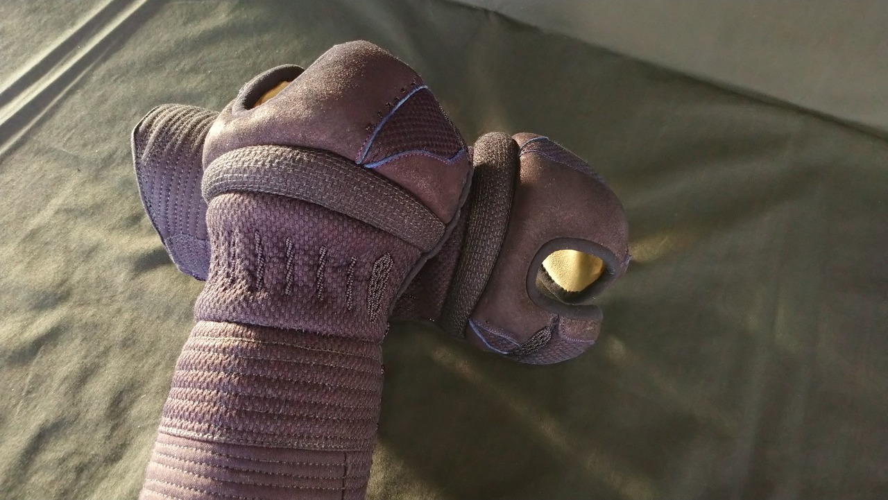 はじめは頑丈さゆえ硬いですが、稽古を重ねるごとに馴染み自在な操作につながります。手の内もしわが少なくなるように取り付けられ、落ち着いた正しい握りをサポートします。